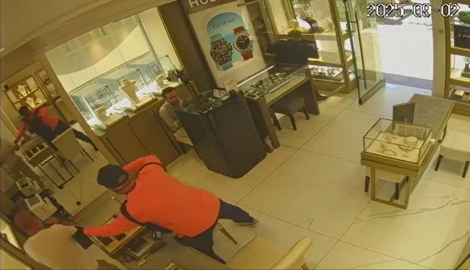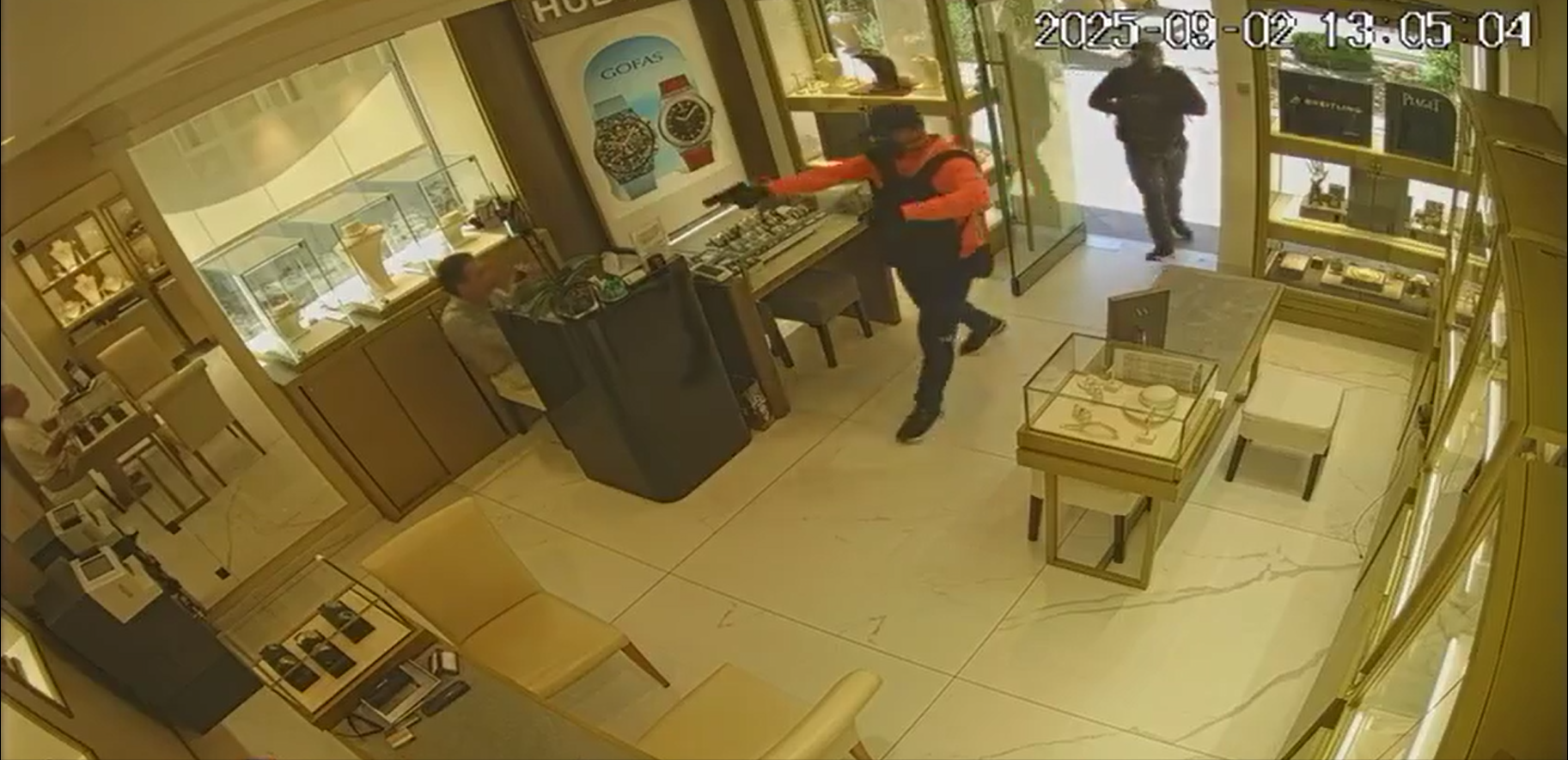 În timpul jafului, bărbatul în vârstă de 48 de ani, împreună cu un complice necunoscut, au imobilizat sub amenințarea armei doi angajați și au sustras ceasuri de lux și obiecte de valoare, în valoare totală de 579.805,75 euro.