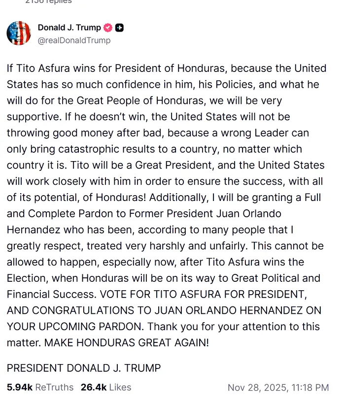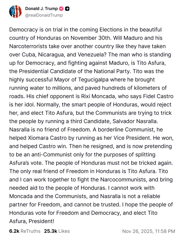 Pe 26 noiembrie 2025, Donald Trump a scris în prima postare de pe Truth Social cu referire la alegerile din Honduras