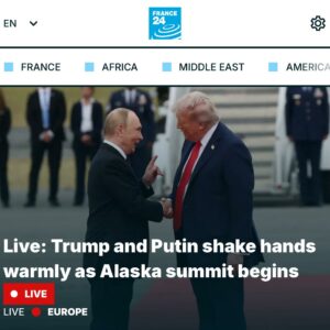”Trump și Putin, strângere călduroasă de mâini în Alaska, la începutul summitului”, titrrează postul France24.