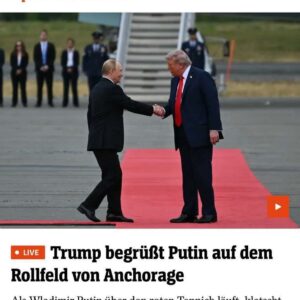 ”Trump l-a întâmpinat pe Putin pe covorul rușu în Anchorage”, titrează publicația germană Der Spiegel.