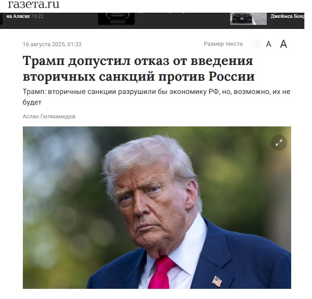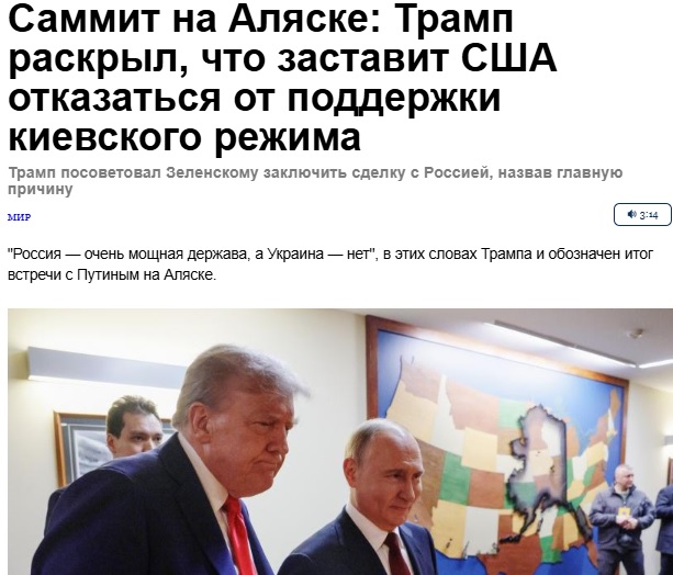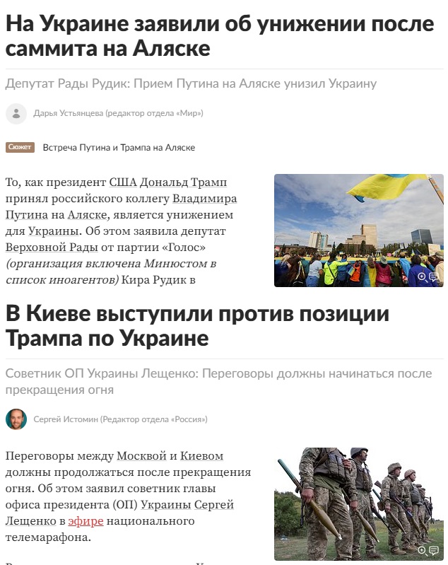 Însă conform presei ruse, Ucraina nu s-a bucurat de cum a evoluat întâlnirea dintre cei doi șefi de stat. Se poate vedea în articolele din Lenta: „Ucraina susține că a fost umilită după summitul din Alaska” și „Kievul se opune poziției lui Trump față de Ucraina”.