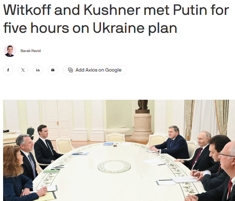 Vladimir Putin și trimisul american Steve Witkoff au discutat, marți seară, la Moscova timp de cinci ore, principalul subiect fiind planul SUA de a pune capăt războiului din Ucraina.  Potrivit rapoartelor din presă, nu s-a ajuns la niciun compromis privind teritoriile ocupate de Rusia în Ucraina în urma întâlnirii dintre Vladimir Putin și Steve Witkoff, care a fost considerată, însă, „utilă”, a anunțat consilierul diplomatic al Kremlinului.