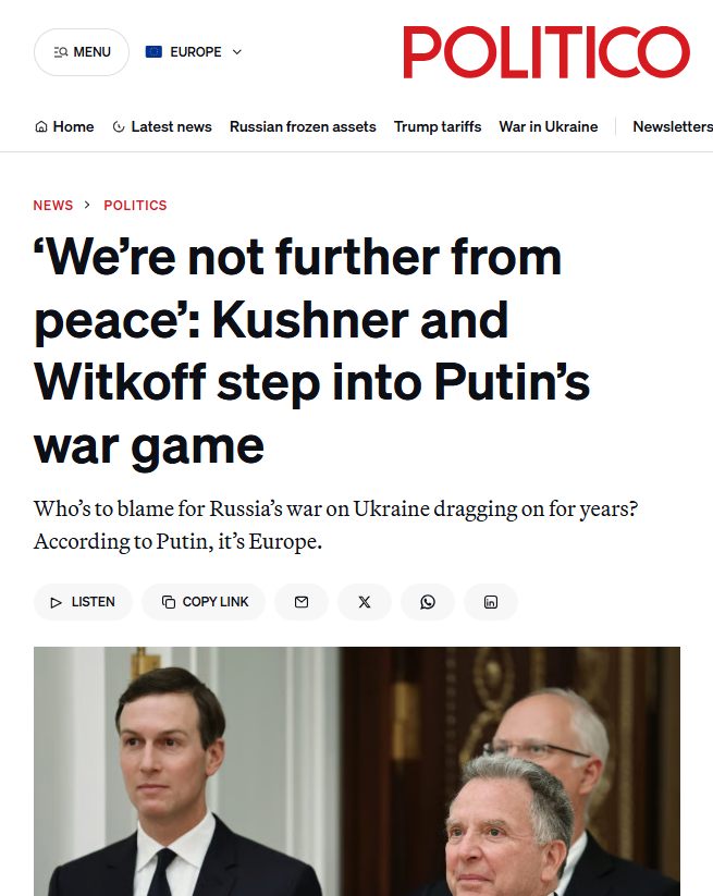 Vladimir Putin a folosit un amestec de farmec, tergiversări calculate și amenințări directe pentru a le arăta trimisilor americani Steve Witkoff și Jared Kushner exact care este poziția Rusiei în ceea ce privește pacea cu Ucraina, scriu jurnaliștii de la Politico.