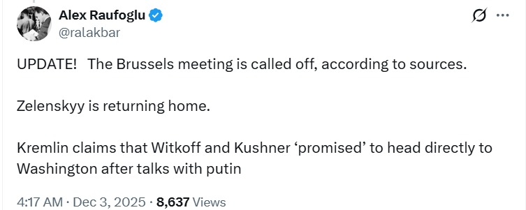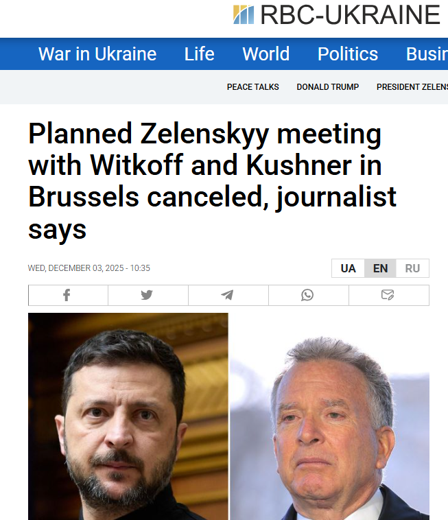 Întâlnirea dintre președintele Ucrainei, Volodimir Zelenski, și delegația SUA, formată din trimisul special al președintelui american Steve Witkoff și Jared Kushner, care trebuia să aibă loc la Bruxelles, a fost anulată, a relatat jurnalistul Alex Raufoglu.