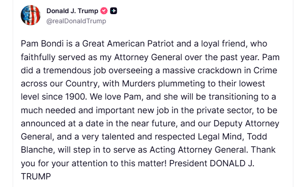 „Pam Bondi este o mare patriotă americană și o prietenă loială, care a servit cu fidelitate ca procuror general în ultimul an. Pam a făcut o treabă extraordinară supraveghind o represiune masivă a criminalității în toată țara noastră, crimele scăzând la cel mai scăzut nivel din 1900. O iubim pe Pam și va trece la un nou post important și foarte necesar în sectorul privat, care va fi anunțat în viitorul apropiat, iar procurorul nostru general adjunct, o minte juridică foarte talentată și respectată, Todd Blanche, va prelua funcția de procuror general interimar”, a scris Donald Trump pe Truth Social.