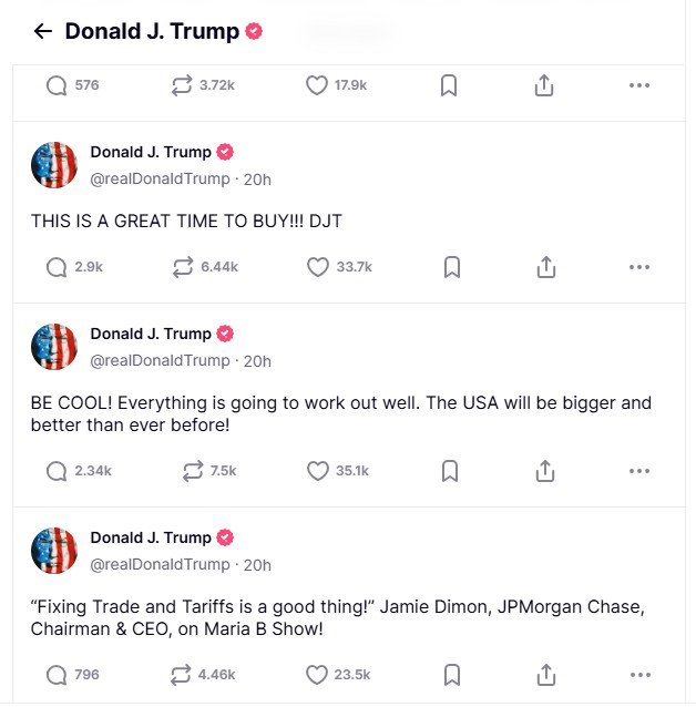 „PĂSTRAȚI-VĂ CALMUL”, le-a spus Trump urmăritorilor săi pe rețelele de socializare, după deschiderea piețelor bursiere. Doar câteva minute mai târziu Trump a scris: „ACESTA ESTE UN MOMENT MINUNAT PENTRU A CUMPĂRA!!”