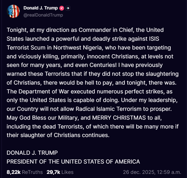 „În această seară, la ordinul meu în calitate de Comandant Suprem, Statele Unite au lansat un atac puternic și mortal împotriva grupării teroriste ISIS din nord-vestul Nigeriei, care vizează și ucide cu brutalitate, mai ales, creștini nevinovați, la un nivel nemaiîntâlnit de mulți ani și chiar de secole!