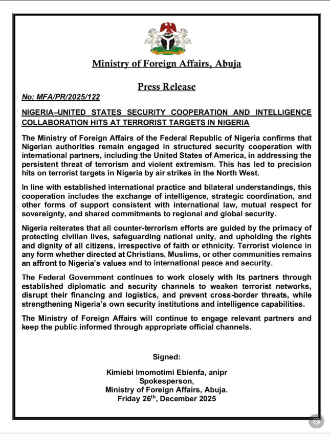Ministerul nigerian al Afacerilor Externe a confirmat vineri că este „angajat într-o cooperare structurată în domeniul securității” cu alte națiuni, inclusiv SUA. Instituția a adăugat că această cooperare „a dus la lovituri precise asupra țintelor teroriste”.