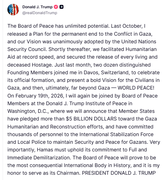 „Consiliul Păcii are un potențial nelimitat. În octombrie anul trecut, am lansat un Plan pentru încetarea definitivă a conflictului din Gaza, iar viziunea noastră a fost adoptată în unanimitate de Consiliul de Securitate al Națiunilor Unite. La scurt timp după aceea, am facilitat ajutorul umanitar cu o viteză record și am asigurat eliberarea fiecărui ostatic, viu și decedat. Chiar luna trecută, două duzini de membri fondatori distinși mi s-au alăturat la Davos, Elveția, pentru a sărbători formarea sa oficială și pentru a prezenta o viziune îndrăzneață pentru civilii din Gaza și apoi, în cele din urmă, mult dincolo de Gaza – PACE MONDIALĂ! Pe 19 februarie 2026, voi fi din nou alături de membrii Consiliului Păcii la Institutul Donald J. Trump pentru Pace din Washington, DC, unde vom anunța că statele membre au promis peste 5 MILIARDE DE DOLARI pentru eforturile umanitare și de reconstrucție din Gaza și au angajat mii de personal în Forța Internațională de Stabilizare și Poliția Locală pentru a menține securitatea și pacea pentru locuitorii din Gaza. Foarte important, Hamas trebuie să își respecte angajamentul față de demilitarizarea completă și imediată. Consiliul Păcii se va dovedi a fi cel mai important organism internațional din istorie și este o onoare pentru mine să fiu președintele său”, a scris Donald Trump pe Truth Social.