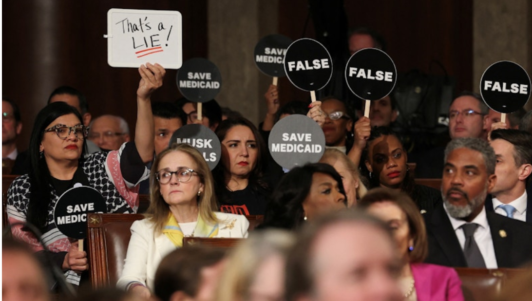 În timpul discursului președintelui Donald Trump în fața Congresului, mai mulți deputați democrați din Cameră, inclusiv Melanie Stansbury și Jasmine Crockett, au ieșit în timp ce purtau tricouri „rezist”, conform CNN.