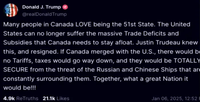 Donald Trump, a cărei victorie i-a fost certificată de Congresul SUA în cursul zilei de azi, insistă pe transformarea Canadei în al 51-lea stat american. Pe platforma sa de socializare, Truth Social, a comentat: