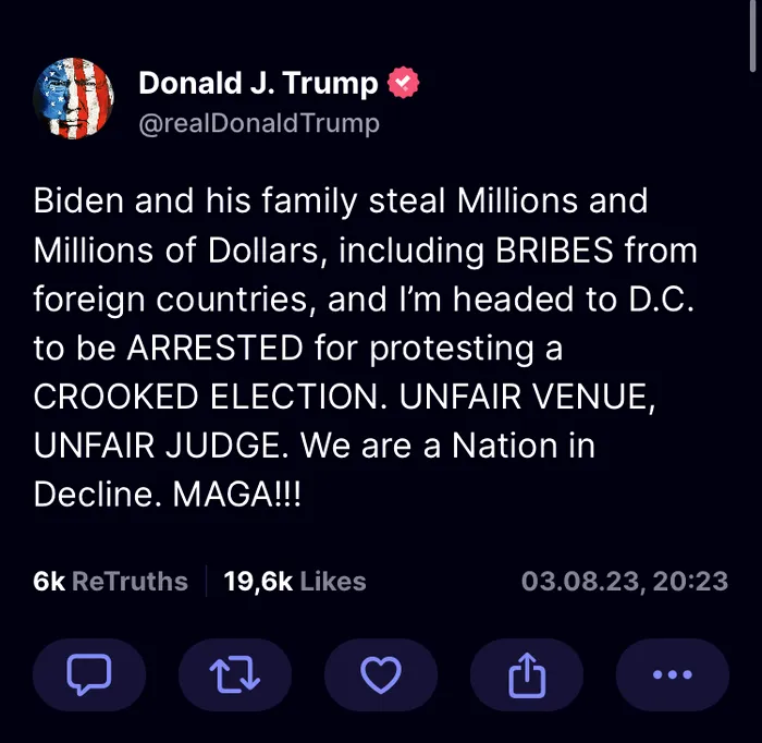 Înainte de a pleca spre tribunalul din Washington DC, Trump a scris pe Truth Social ca Statele Unite sunt o națiune în declin.