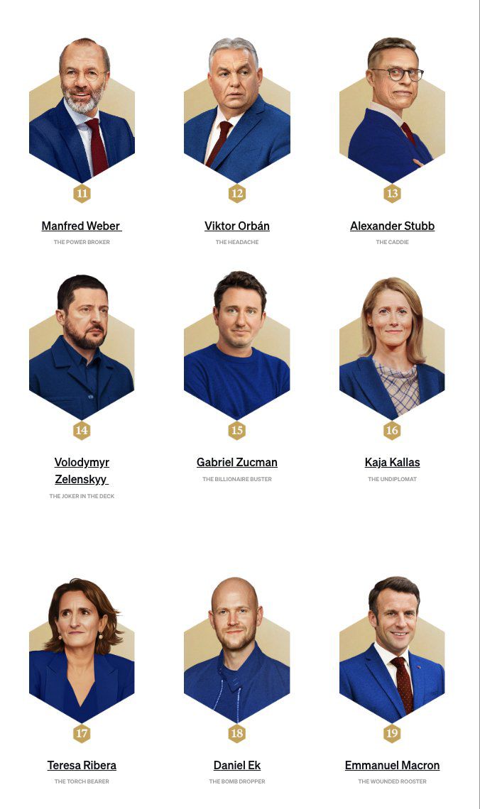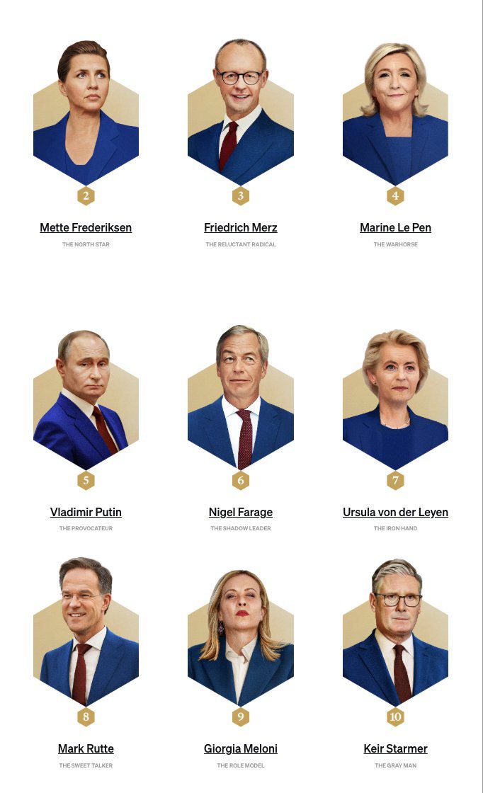 Publicația a concluzionat că nimeni nu a exercitat o influență mai mare asupra Europei în ultimul an decât a făcut-o președintele american. Podiumul este completat de Mette Frederiksen, prim-ministrul Danemarcei, care se află pe locul doi, iar pe locul trei se află Friedrich Merz, cancelarul Germaniei. Surpriza este dată de persoana aflată pe locul 4, Marine Le Pen, liderul extremei dreapta din Franța, în timp ce Emmanuel Macron se află abia pe locul 19. O altă surpriză în topul publicației cu cei mai influenți politicieni care vor modela politica continentului în anul 2026 este dată de Vladimir Putin, care ocupă locul 5 în clasament. În comparație, Volodimir Zelenski ocupă abia locul 14. Din topul celor mai influenți 28 oameni politici din Europa nu face parte nici un român. În schimb, publicația menționează un politician român în topul celor care pot afecta status quo-ului în anul 2026.