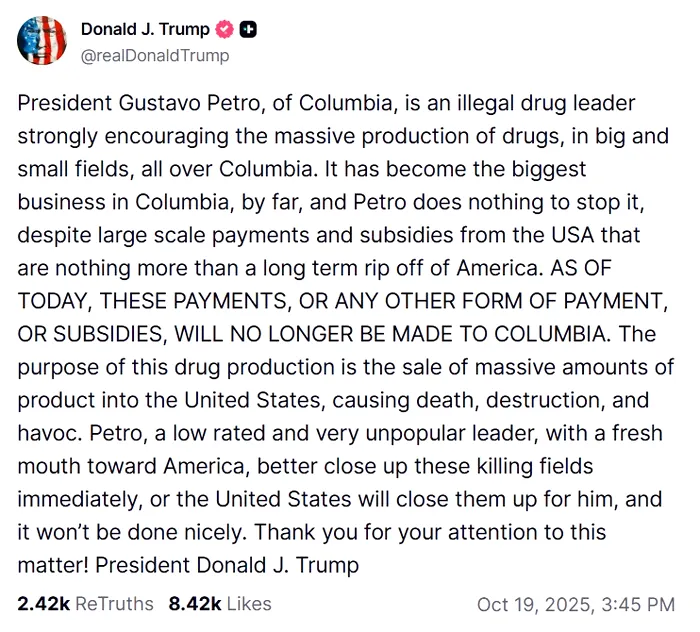 „Președintele Columbiei, Gustavo Petro, este un lider al drogurilor ilegale care încurajează puternic producția masivă de droguri, în câmpuri mari și mici, în toată Columbia. Aceasta a devenit, de departe, cea mai mare afacere din Columbia, iar Petro nu face nimic pentru a o opri, în ciuda plăților și subvențiilor pe scară largă din partea SUA, care nu sunt altceva decât o înșelătorie pe termen lung a Americii. ÎNCEPÂND DE ASTĂZI, ACESTE PLĂȚI SAU ORICE ALTĂ FORMĂ DE PLATĂ SAU SUBVENȚIE NU VOR MAI FI EFECTUATE ÎN COLUMBIA. Scopul acestei producții de droguri este vânzarea de cantități masive de produse în Statele Unite, provocând moarte, distrugere și haos. Petro, un lider slab cotat și foarte nepopular, cu o gură proaspătă față de America, ar face bine să închidă imediat aceste câmpuri de ucidere, sau Statele Unite le vor închide pentru el, și nu se va face frumos. Vă mulțumim pentru atenția acordată acestei probleme! Președintele Donald J. Trump”, a transmis președintele american.
