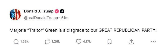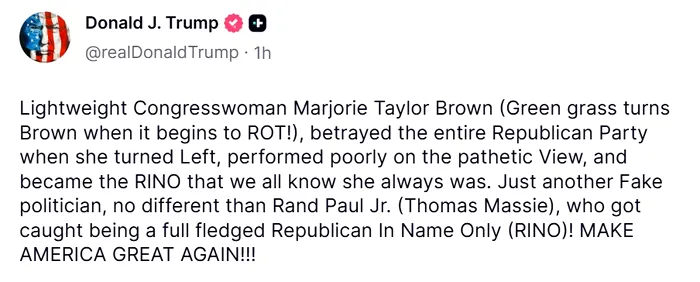„Slăbănoaga de congrewoman Marjorie Taylor Brown (iarba verde devine maro când începe să se descompună), a trădat întreg Partidul Republican când ea a devenit de Stânga, performând slab la paterica emisiune „View” și a devenit un „RINO” despre care știam cu toții că era. Doar o altă politiciană falsă, nu mai diferită de Rand Paul Jr. (Thomas Massie).”