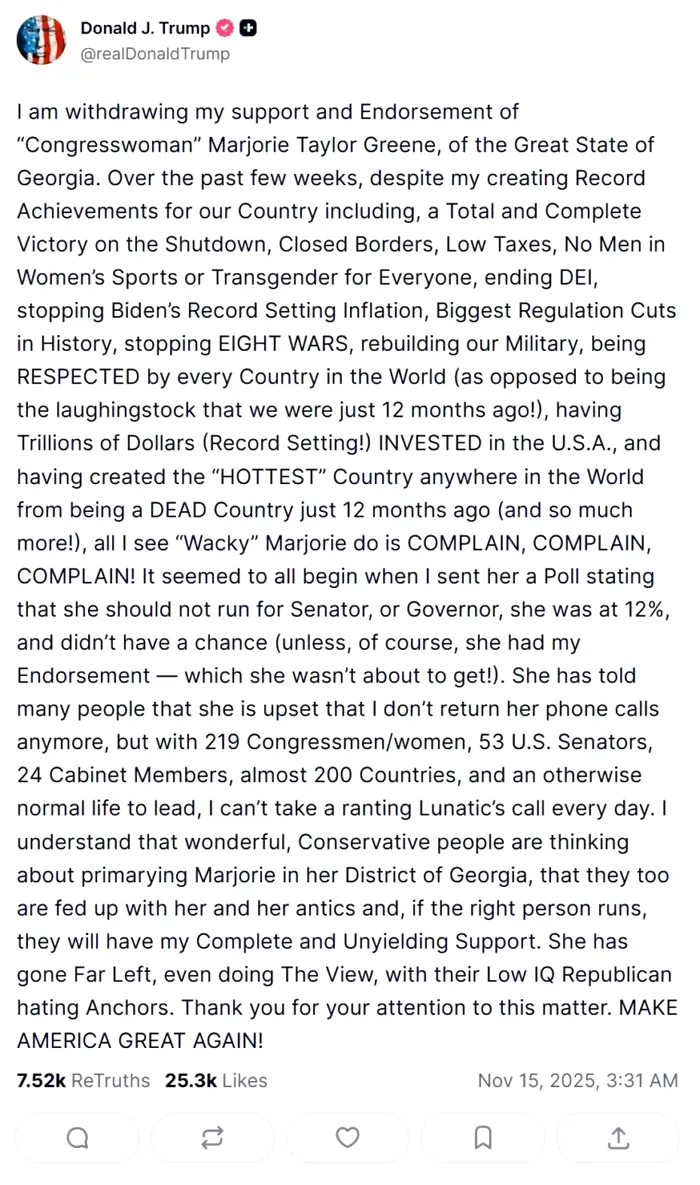 „Îmi retrag sprijinul și susținerea pentru „Congresmena” Marjorie Taylor Greene, din Marele Stat Georgia. În ultimele săptămâni, în ciuda realizărilor record pe care le-am creat pentru țara noastră, inclusiv o victorie totală și completă asupra închiderii guvernului, granițe închise, impozite mici, interzicerea bărbaților în sporturile feminine sau a persoanelor transgender pentru toată lumea, încetarea DEI, oprirea inflației record a lui Biden, cele mai mari reduceri de reglementări din istorie, oprirea a OPT RĂZBOAIE, reconstrucția armatei noastre, faptul că am fost RESPECTATĂ de fiecare țară din lume (spre deosebire de a fi râsul lumii care eram acum doar 12 luni!), faptul că am avut trilioane de dolari (record!) INVESTIȚII în SUA și am creat cea mai „SEXY” țară din lume, fiind o țară MOARTĂ acum doar 12 luni (și multe altele!), tot ce o văd pe „trăsnita” Marjorie făcând este să SE PLÂNGĂ, SE PLÂNGĂ, SE PLÂNGĂ! Totul pare să fi început când i-am trimis un sondaj în care i-am spus că nu ar trebui să candideze pentru senator sau guvernator, ea avea 12% și nu avea nicio șansă (cu excepția cazului în care, desigur, avea susținerea mea – pe care nu avea de gând să o primească!). Le-a spus multor oameni că este supărată că nu-i mai răspund la apeluri telefonice, dar cu 219 congresmeni/congresmene, 53 de senatori americani, 24 de membri ai cabinetului, aproape 200 de țări și o viață altfel normală de dus, nu pot suporta apelul telefonic din partea unei nebune în fiecare zi. Înțeleg că oameni minunați, conservatori, se gândesc să o promoveze pe Marjorie la alegerile primare în districtul ei, Georgia, că și ei s-au săturat de ea și de acțiunile ei și, dacă persoana potrivită candidează, vor avea sprijinul meu complet și neclintit. A devenit extrem de stânga, chiar participând la The View, cu ancorele lor cu IQ scăzut care îi urăsc pe republicani. Vă mulțumesc pentru atenția acordată acestei probleme. FĂCEȚI AMERICA MĂREAȚĂ DIN NOU!”