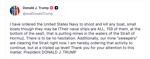 „Am ordonat Marinei Statelor Unite să tragă și să distrugă orice ambarcațiune, oricât de mică ar fi (navele lor militare sunt TOATE, 159 la număr, pe fundul mării!), care plasează mine în apele Strâmtorii Ormuz. Nu trebuie să existe nicio ezitare. În plus, dragoarele noastre de mine curăță strâmtoarea chiar acum. Prin prezenta, ordon ca această activitate să continue, dar la un nivel triplat! Vă mulțumesc pentru atenția acordată acestei probleme”, a scris Donald Trump pe Truth Social.