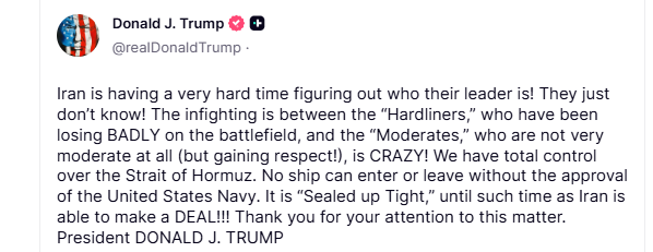 Într-o postare ulterioară pe Truth Social, Trump a precizat că în Iran există două facțiuni cărora le „este foarte greu să își dea seama cine este liderul”. Cu toate acestea, Statele Unite vor continua să exercite blocada în Strâmtoarea Ormuz până când Teheranul va veni la masa negocierilor.