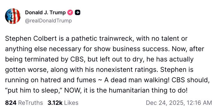 „Stephen Colbert este un dezastru patetic, fără talent sau orice altceva necesar pentru succesul în show business”, a scris Trump într-o postare la ora 12:16 a.m. ET pe platforma sa Truth Social. „Acum, după ce a fost concediat de CBS, dar lăsat în voia sorţii, situaţia lui s-a înrăutăţit, la fel şi ratingurile sale inexistente. Stephen se bazează pe ură şi furie ~ Un om mort care merge! CBS ar trebui să-l „trimită la somn” ACUM, este un gest umanitar!”.