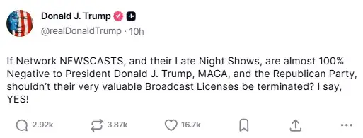 „Dacă ştirile difuzate de reţelele de televiziune şi emisiunile lor de noapte sunt aproape 100% negative faţă de preşedintele Donald J. Trump, MAGA şi Partidul Republican, nu ar trebui să li se retragă licenţele de difuzare, care sunt foarte valoroase? Eu spun DA!”. Apoi, la trei minute după această postare, Trump a scris: „CRĂCIUN FERICIT!!!”.