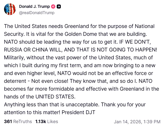 „Statele Unite au nevoie de Groenlanda în scopul Securității Naționale. Este vitală pentru Domul de Aur pe care îl construim. NATO ar trebui să ne deschidă calea pentru a-l obține. DACĂ NU O FACEM, RUSIA SAU CHINA O VA FACE, IAR ASTA NU SE VA ÎNTÂMPLA! Din punct de vedere militar, fără vasta putere a Statelor Unite, o mare parte din care am construit-o în timpul primului meu mandat și pe care o duc acum la un nivel nou și chiar mai înalt, NATO nu ar fi o forță eficientă sau un factor de descurajare – Nici pe departe! Ei știu asta, și la fel și eu. NATO devine mult mai formidabil și mai eficient cu Groenlanda în mâinile STATELOR UNITE. Orice mai puțin de atât este inacceptabil”, spune Donald Trump pe Truth Social.