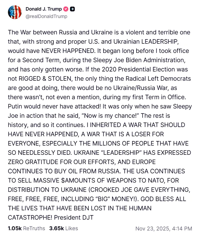 Donald Trump a făcut brusc un atac public la adresa conducerii ucrainene. Într-o tiradă amplă pe Truth Social, el a acuzat Kievul de „nerecunoștință” pentru „eforturile sale de pace” și a declarat că războiul „nu ar fi început niciodată cu o conducere adecvată” — adresându-și acuzațiile lui Zelenski și Biden, dar nu lui Putin.
