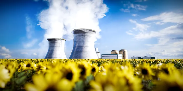 Atomic power station or nuclear power plant producing electricity next to sunflower field.