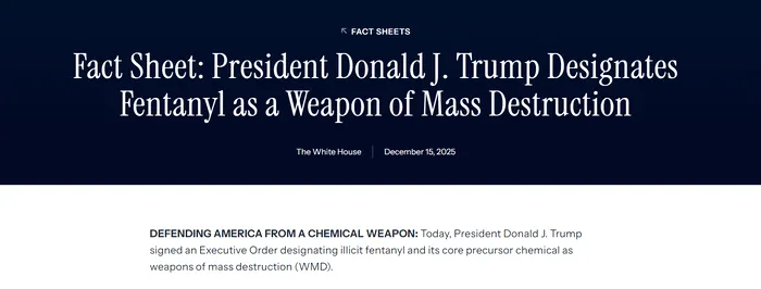 Președintele Statelor Unite a semnat luni un ordin executiv care declară fentanilul drept armă de distrugere în masă și care oferă guvernului american putere juridică suplimentară în eforturile sale de a combate traficul cu droguri sintetice. În discursul său din Biroul Oval, Donald Trump a spus că volumul de droguri care intră în SUA pe cale maritimă a scăzut cu 94%, iar diferența de procent este introdusă în Statele Unite pe cale terestră. Trump a adăugat că fluxurile de droguri reprezintă „o amenințare militară directă pentru Statele Unite ale Americii”.