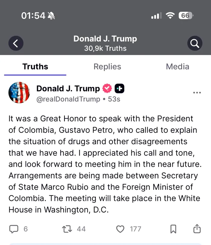 „A fost o mare onoare să vorbesc cu președintele Columbiei, Gustavo Petro, care m-a sunat să ne explice situația drogurilor și alte neînțelegeri pe care le-am avut. Am apreciat apelul și tonul său și aștept cu nerăbdare să mă întâlnesc cu el în viitorul apropiat. Se fac aranjamente între secretarul de stat Marco Rubio și ministrul de externe al Columbiei. Întâlnirea va avea loc la Casa Albă din Washington, D.C.”