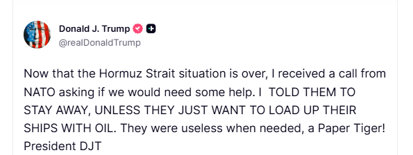 „Acum că situația din Strâmtoarea Ormuz s-a încheiat, am primit un telefon de la NATO în care mă întrebau dacă am avea nevoie de ajutor. LE-AM SPUS SĂ STEA DEPARTE, DOAR DACĂ NU VOR DOAR SĂ-ȘI ÎNCARCE NAVELE CU PETROL. Au fost inutili când a fost nevoie, un tigru de hârtie!”, a scris Trump.