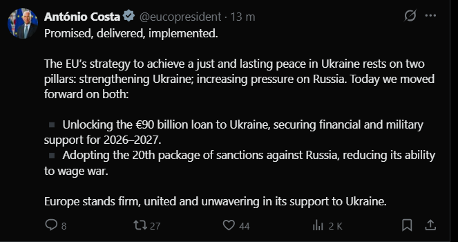 „Ne îndreptăm spre Cipru cu vești bune. Salut acordul statelor membre privind împrumutul de 90 de miliarde de euro acordat Ucrainei pentru perioada 2026-2027 și privind cel de-al 20-lea pachet de sancțiuni.