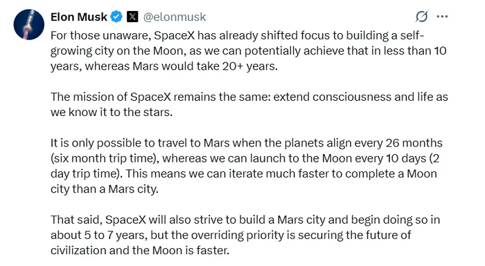 Prioritatea SpaceX s-a mutat oficial către colonizarea satelitului natural al Pământului, a anunțat Elon Musk într-o postare pe pagina de socializare X. Argumentul principal pe care îl invocă Musk este frecvența ferestrelor de lansare. În timp ce o călătorie spre Marte este posibilă doar o dată la 26 de luni, când planetele se aliniază, către Lună se poate lansa la fiecare 10 zile. De asemenea, timpul de călătorie este de doar 2 zile, comparativ cu cele 6 luni necesare pentru Marte.