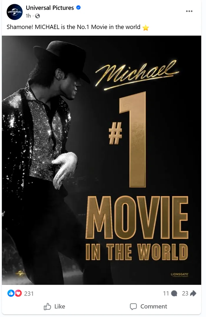 „Această performanță record este o dovadă a incredibilei echipe de realizatori formată din producătorul Graham King și regizorul Antoine Fuqua, a unei distribuții uimitoare conduse de interpretarea unică a lui Jaafar Jackson, a partenerilor noștri de talie mondială de la Universal, a cooperării și sprijinului descendenților lui Michael Jackson și a echipei noastre neobosite și excepțional de talentată, Lionsgate”, a declarat într-un comunicat Adam Fogelson, președintele companiei Lionsgate Motion Picture Group.