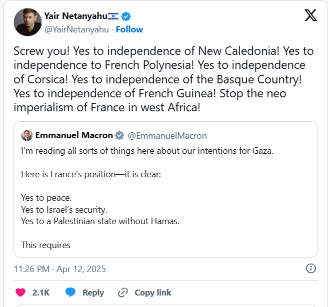 Yair Netanyahu, 33 de ani, fiul lui Benjamin Netanyahu și-a exprimat furia față de afirmațiile lui afirmațiile lui Emmanuel Macron referitoare la „recunoașterea unui stat palestinian” prin intermediul unor postări pe platforma X.