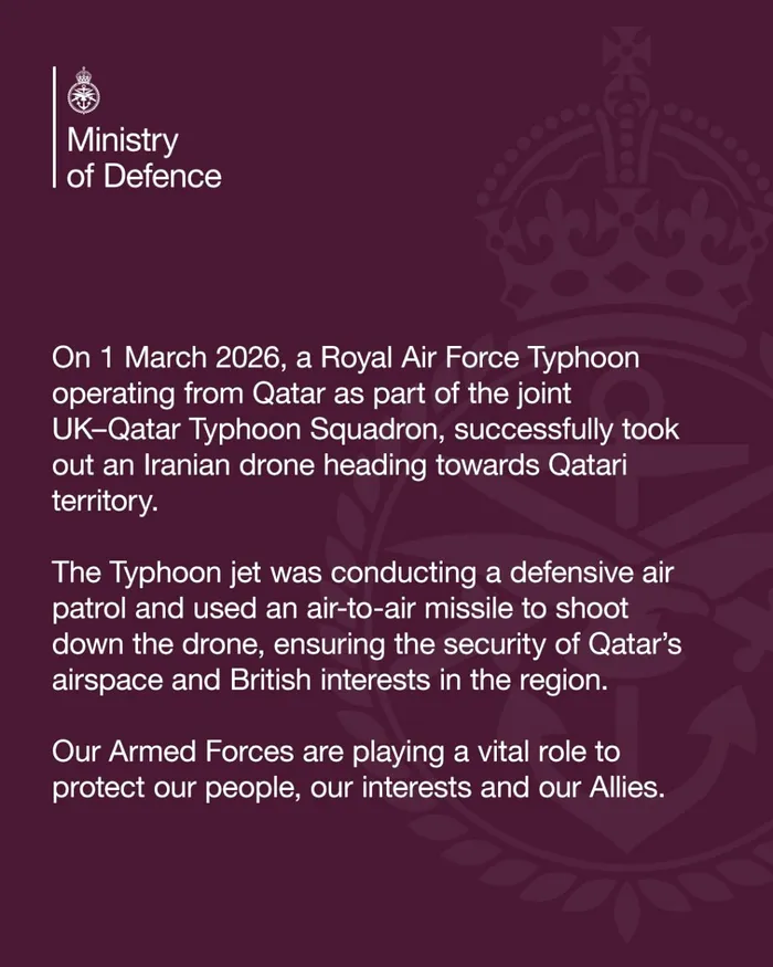 Aeronavele Typhoon au efectuat patrularea aeriană defensivă și au folosit rachete aer-aer pentru a distruge drona, securizând spațiul aerian al Qatarului și interesele britanice în regiune.