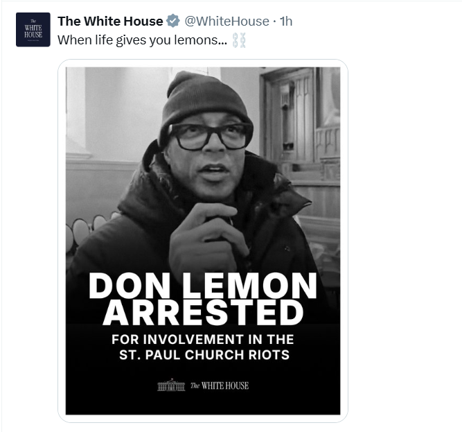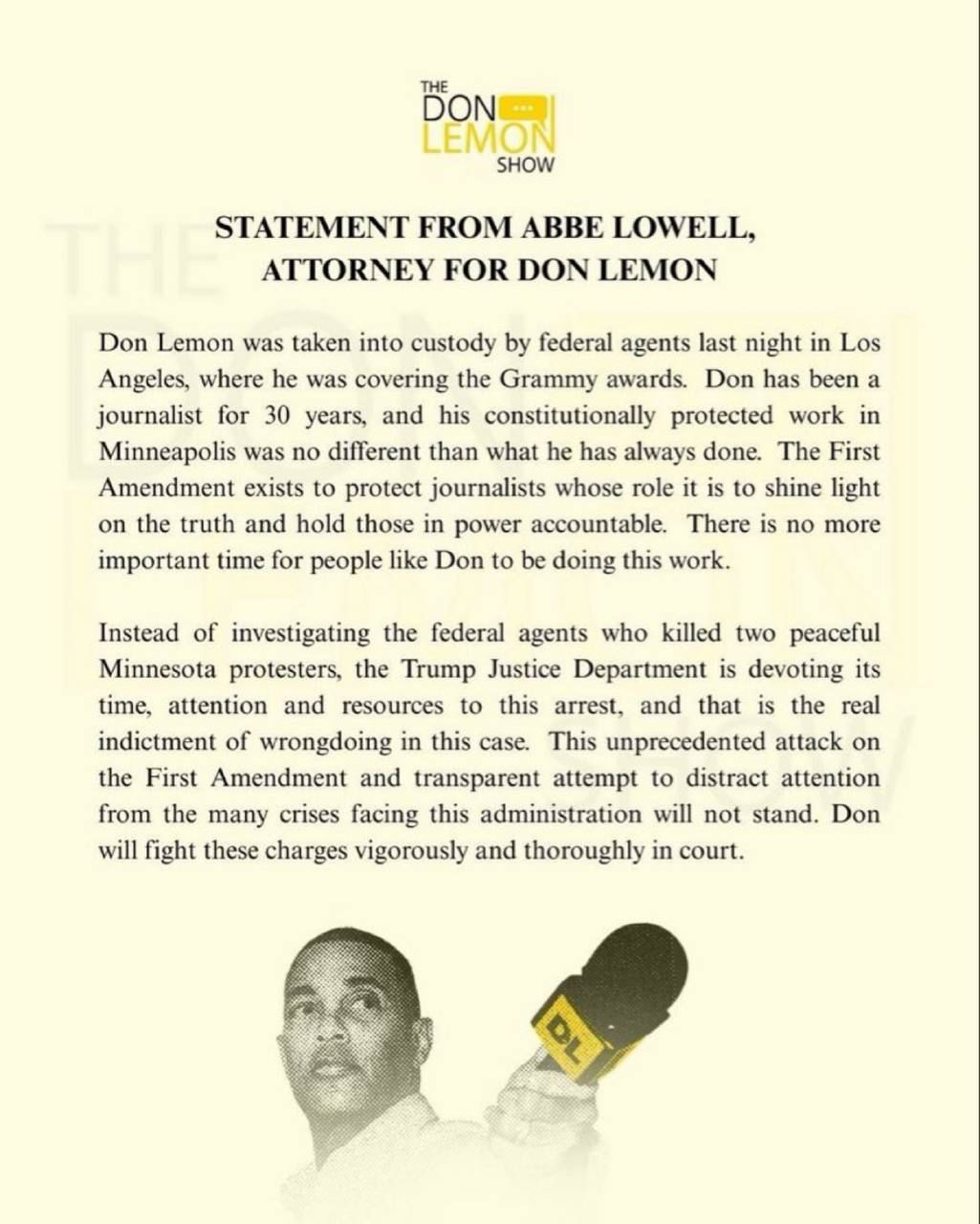 „Don Lemon a fost reținut aseară de agenți federali în Los Angeles, unde relata despre premiile Grammy”, potrivit unei declarații atribuite avocatului lui Lemon, Abbe Lowell. „Don este jurnalist de 30 de ani, iar munca sa protejată constituțional în Minneapolis nu a fost diferită de cea pe care a făcut-o întotdeauna. Primul Amendament există pentru a proteja jurnaliștii al căror rol este de a scoate la iveală adevărul și de a-i trage la răspundere pe cei aflați la putere. Nu există un moment mai important ca oameni ca Don să facă această muncă.”
