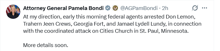 Agenții FBI și Homeland Security Investigations l-au arestat pe fostul prezentator CNN, Don Lemon, pentru că ar fi participat la un protest împotriva politicilor de imigrare, care au avut loc pe 18 ianuarie la Cities Church din St. Paul, Minnesota. Lemon a transmis în direct acel eveniment pe canalul său de YouTube, în timpul căruia protestatarii au întrerupt serviciul religios.