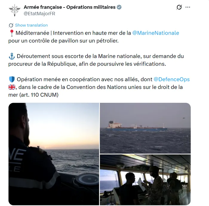 „În această dimineață, Marina Franceză a abordat un petrolier provenind din Rusia, supus unor sancțiuni internaționale și suspectat că arborează un pavilion fals. Operațiunea a fost desfășurată în marea liberă din Mediterana, cu sprijinul mai multor aliați ai noștri. A fost efectuată în strictă conformitate cu Convenția Națiunilor Unite privind dreptul mării. A fost deschisă o anchetă judiciară. Nava a fost deviată. Suntem hotărâți să respectăm dreptul internațional și să asigurăm aplicarea eficientă a sancțiunilor. Activitățile „flotei din umbră” contribuie la finanțarea războiului de agresiune împotriva Ucrainei”, a precizat Emmanuel Macron pe pagina de X.