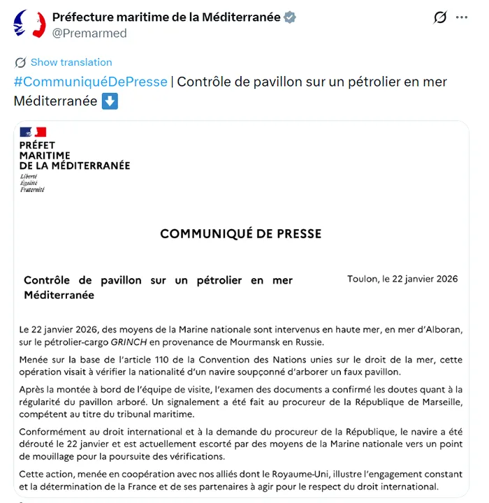 Într-un comunicat, prefectura maritime a indicat că nava în cauză tocmai plecase din Murmansk și, „după echipa de îmbarcare, examinarea documentelor a confirmat îndoielile cu privire la validitatea pavilionului arborat”.