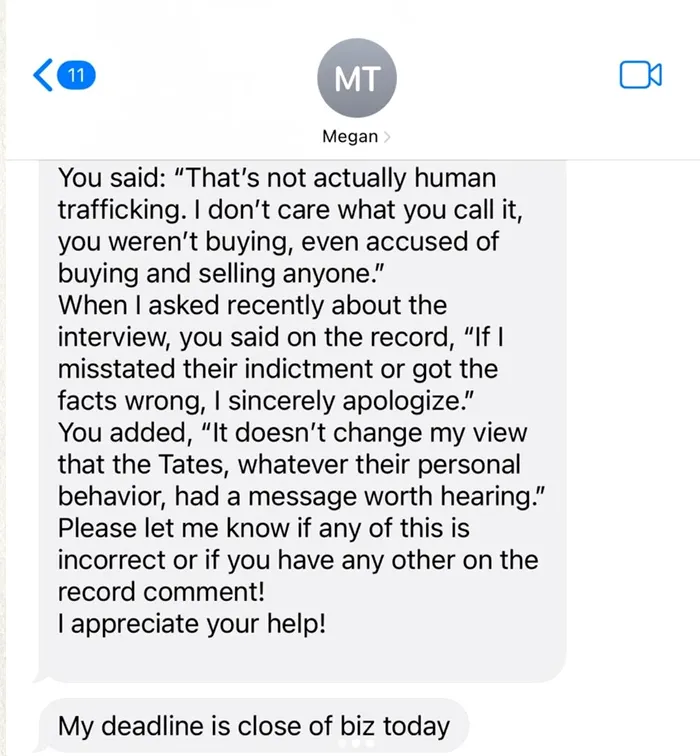 „Salutare Tucker, sunt tot eu, Megan. Povestea mea despre eliberarea fraților Tate din România va rula în această săptămână. Am găsit că a fost punctul culminant al eforturilor depuse de Andrew de-a lungul anilor pentru a forma alianțe cu personalități puternice din dreapta americană.