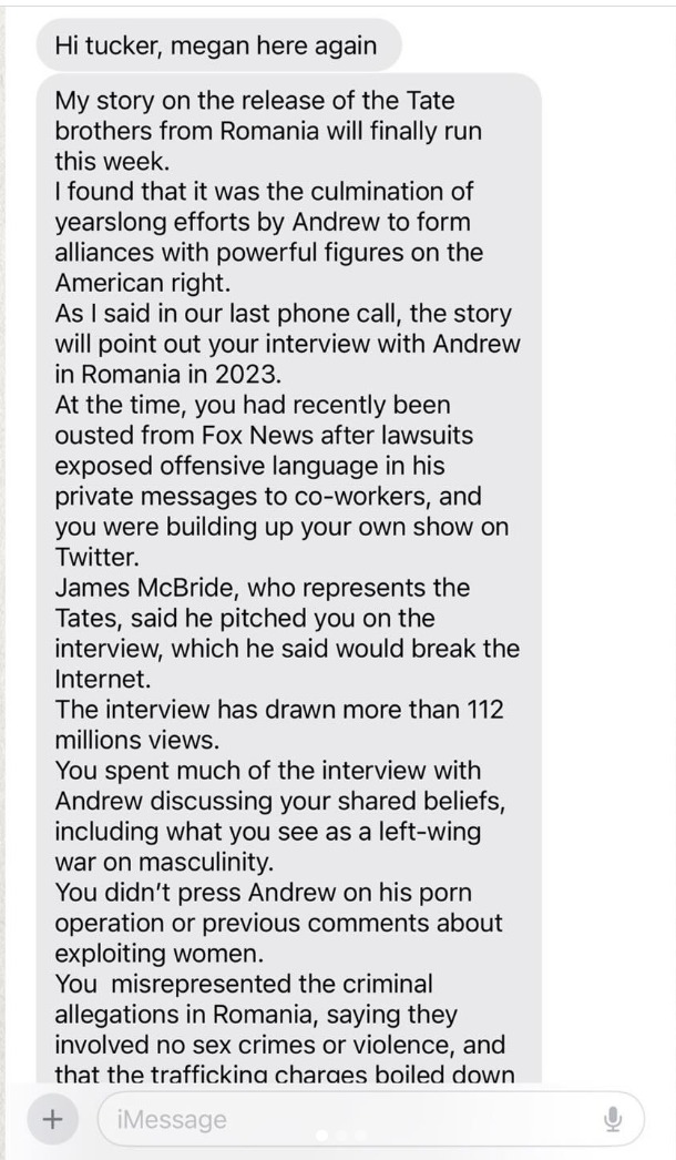 Reporterița de la New York Times, autointitulată Megan, îl întreabă pe Tucker Carlson despre interviul realizat cu Andrew Tate din 2023 pentru a-i cere clarificări, dezvăluind că are o investigație de publicat despre legăturile lui Andre Tate cu personalități de dreapta din Statele Unite.