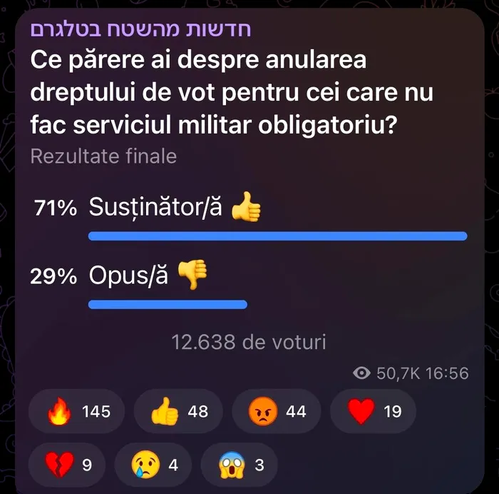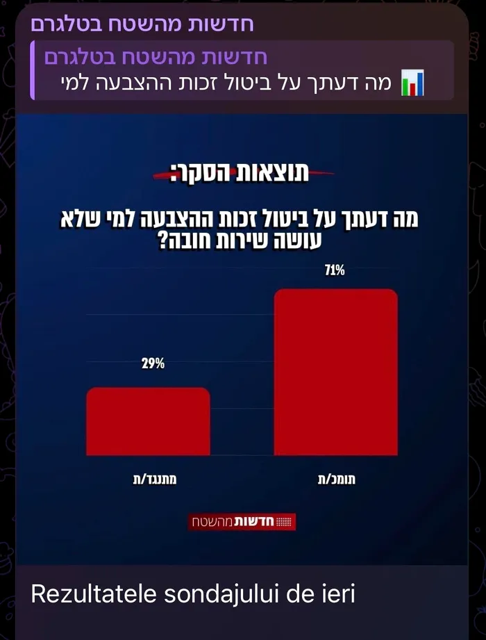 Pe rețelele de socializare din Israel se discută și se fac sondaje despre anularea dreptului de vot pentru cei care refuză înrolarea în armată.