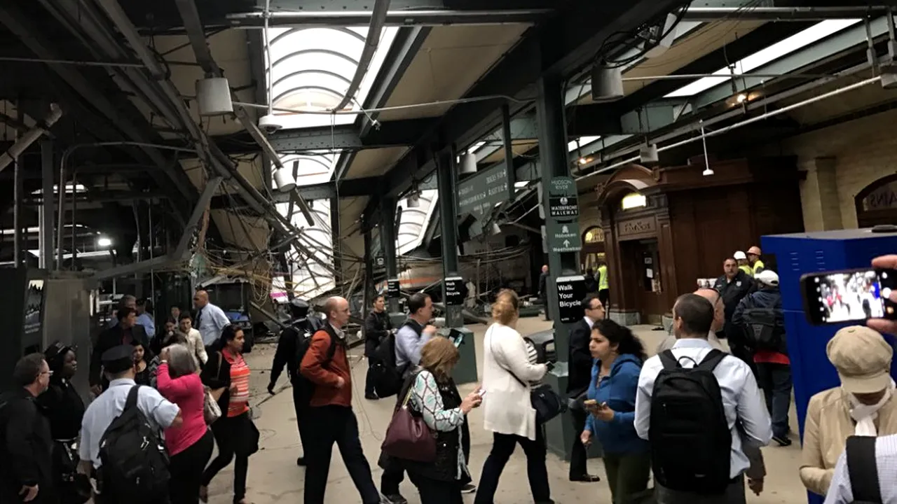 Un tren de navetiști a deraiat, iar vagoanele au lovit peronul. O parte a gării s-a prăbușit.