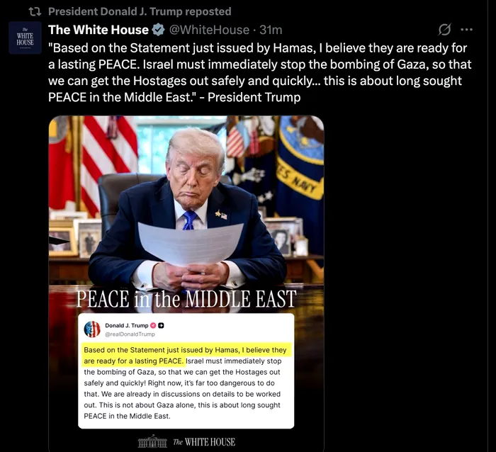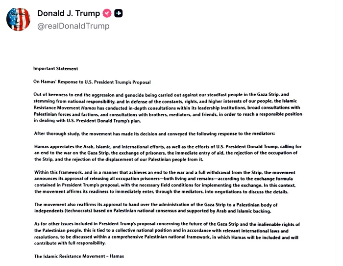Într-o declarație analizată de sursa citată, Hamas și-a prezentat răspunsul la planul în 20 de puncte al lui Donald Trump, după ce președintele a dat grupării militante palestiniene termen până duminică pentru a accepta sau respinge propunerile.