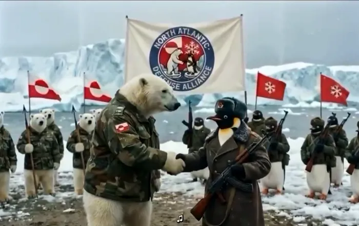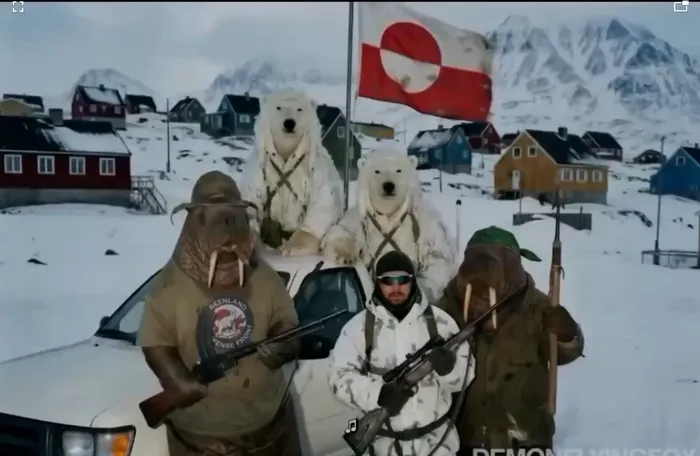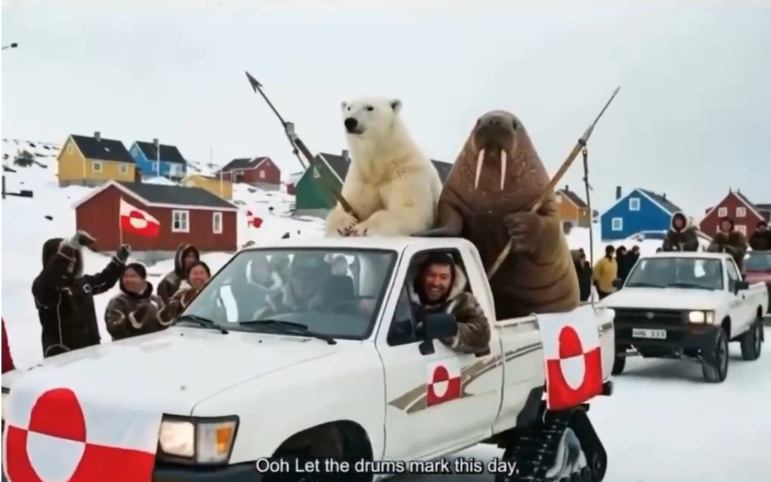 Groenlanda a răspuns cu o piesă satirică, care se numește „Uriașul flămând” (o aluzie clară la Donald Trump), însoțită de un clip realizat cu IA, ce înfățișează urși polari și morse, echipați militar, gata să îi înfrunte pe americani.