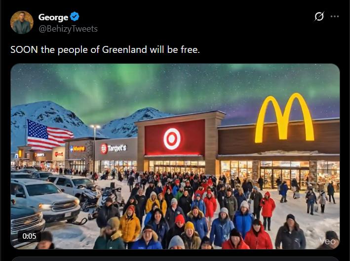 Imagini generate de inteligența artificială, care reimaginează Groenlanda sub stăpânirea Statelor Unite, au devenit virale pe social-media. Conținutul a fost distribuit inițial de influencerul George Behizy, un susținător al administrației Trump. Groenlandezii au răspuns la rândul lor cu o satiră savuroasă la adresa americanilor și a lui Donald Trump.