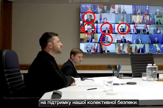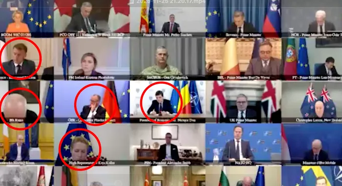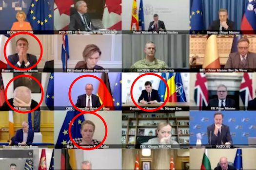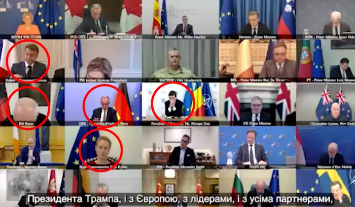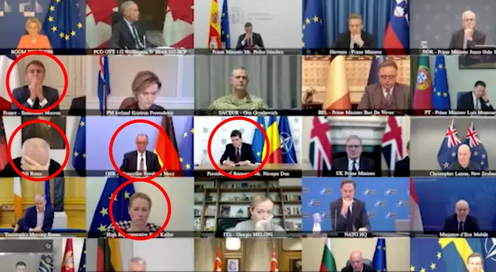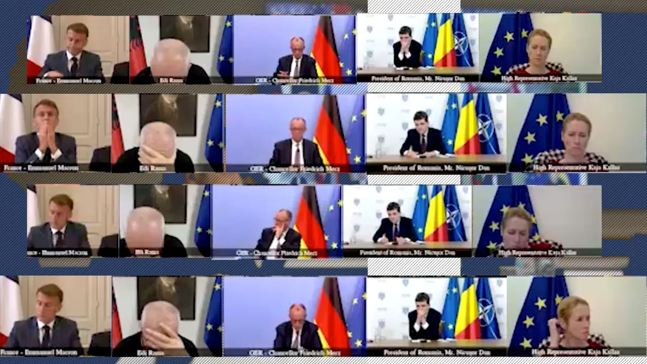 Președintele Franței, Emmanuel Macron, pare la un moment dat că se roagă, privind în sus, Edi Rama – premierul Albaniei – stă tot timpul gânditor, uitându-se în jos, cu mâna pe frunte, cancelarul Germaniei – Friedrich Merz – este cât de cât atent dar la un moment dat privește în gol spre pereții încăperii în care se afla, în timp ce liderul diplomației europene – Kaja Kallas are tot felul de preocupări: ori își aranjează părul, ori se încruntă subit, ori se scobește în urechi.