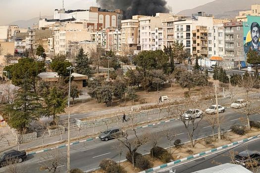 Mulțimi de oameni pot fi văzute privind fumul gros care se ridică spre cer, în ciuda traficului abundent din nordul Teheranului în această dimineață.