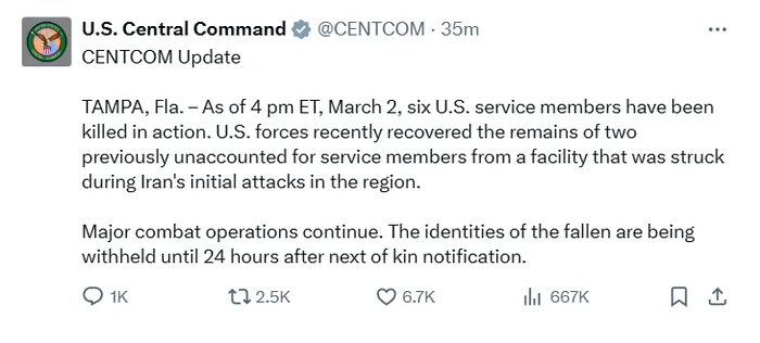 „Pe 2 martie, la ora 16, șase militari SUA au fost uciși în acțiune. Forțele SUA au recuperat rămășițele a doi militari dispăruți pe durata atacurilor iraniene inițiale în regiune. Operațiunile militare majore continuă. Identitatea celor căzuți va fi ținută secret până la 24 de ore după notificarea rudelor”, a anunțat CENTCOM.
