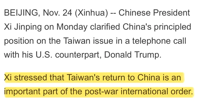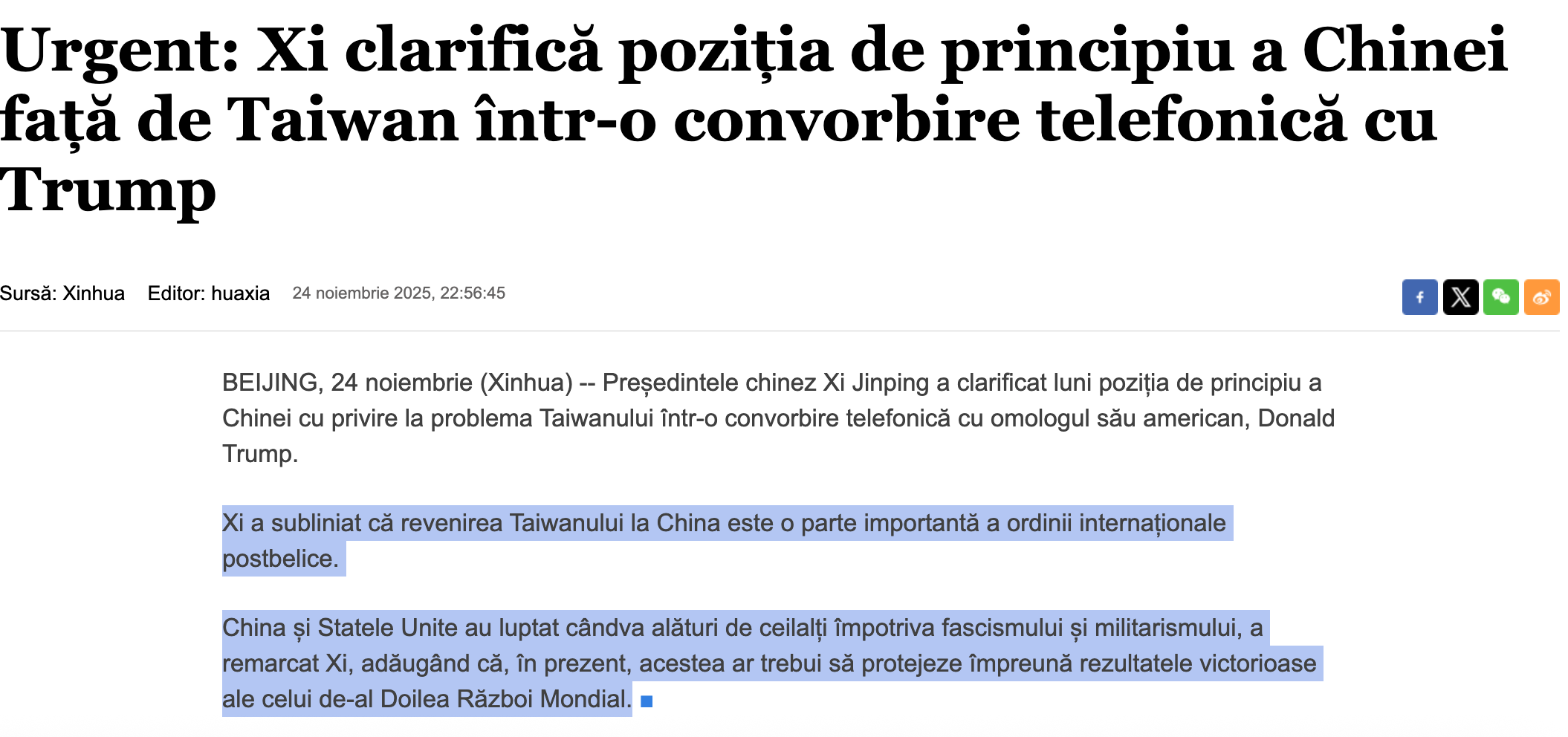 „Xi a subliniat că revenirea Taiwanului la China este o parte importantă a ordinii internaționale postbelice.
